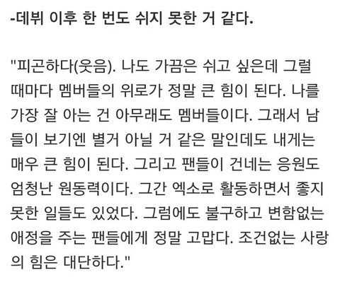 "두 가지 일을 병행하는 게 힘들지 않은 건 아녜요. 하지만 동고동락하는 멤버들의 한 마디 한 마디, 팬들의 열정적인 응원들이 모여서 생각보다 큰 힘으로 다가와서 저를 다시 움직이게 만들어요."
