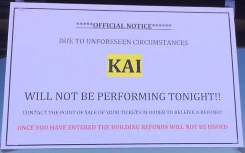 뜻하지않은 사정으로 종인이 오늘 무대 못한다고 공연장 앞에 이거 세워놨대 글고 15일은 미국대통령의 날이라 휴무래 슴 공지 없는게 왜이렇게 불안하지 당장 내일 벤쿠버콘 뭐라 공지는 해야지