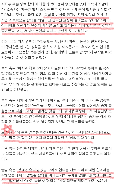 기사에 쓰여있듯이 법정에서 증거 불충분으로 루머판명나있고 종결안났다하는 애들이 대갈텅텅인거임 서지수는 명백함 종결난사건인것