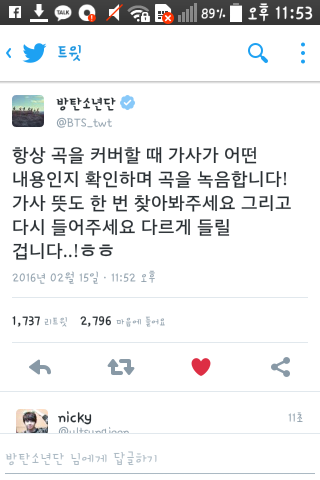 아까 정국이 커버곡들으면서 가사뽑아서 봤는데 가사번역보니까 진짜설레는데 뭔가아련?하더라고 근데 저렇게말해주다니ㅠㅠㅠㅜ