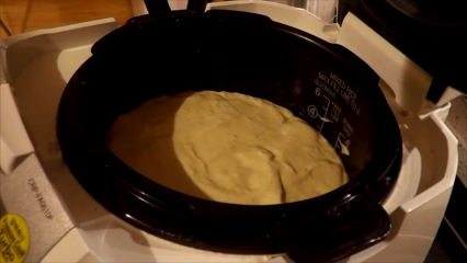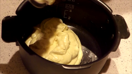 7. 밥솥에 반죽을 넣고, 큰기포들을 빼주기위해 두세번 탕탕! 10cm정도의 높이에서 떨어트려주세요.