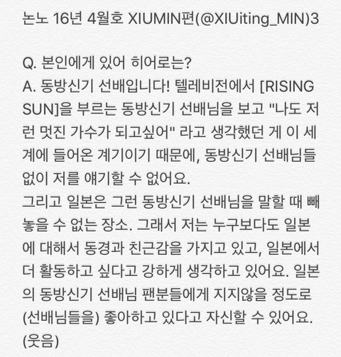 A. 블리치, 헌터헌터, 드래곤볼... 역시 애니메이션이에요 일본어 공부도 겸해서 이동중에 계속 봅니다 그 중 제일 좋아하는 것은 원피스 등장인물인 에이스처럼 엑소의 에이스가 되고 싶어요!