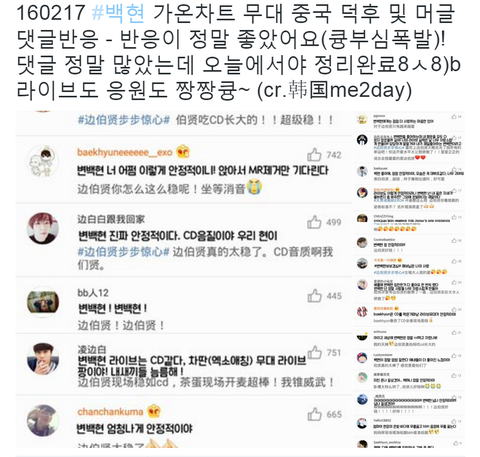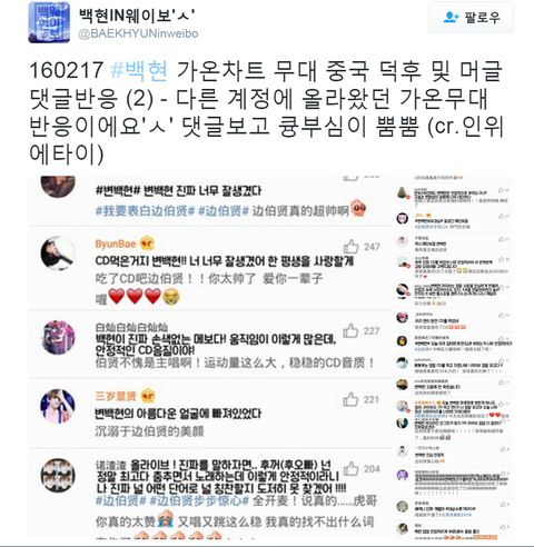 백현 가온차트 무대 중국 덕후 및 머글 댓글반응