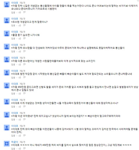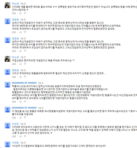 위너 철없어 무대를 보려고 하는중에 찢어진바지에 대한 동영상이있어서 보고 댓글을 보던중 이런댓글이 있었음.. 댓글을 하나하나 차근차근 다 읽어봤는데 나는 아예잘못이없다고 생각하진않지만 꼭이렇게 욕하면서 팬들보고 김치녀다 어쩐다 이러는게 정말 말심하다 생각한게 사실 그리고 450만원짜리 바지 찢은거를 성폭행이랑 비교하는거 자체는 진짜 아니라고 생각함