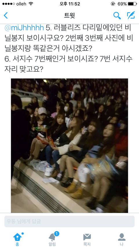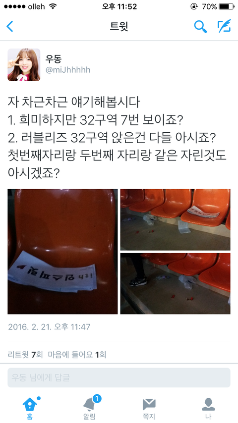 슬로건 버리고 갔다는 그 분이 또 올리신거 러블리즈 좌석확인중이니 저기 흔들린 7 앞에 있는 저 번호 포토샵같은걸로 알아내실 수 있는 분들 몇번인지좀