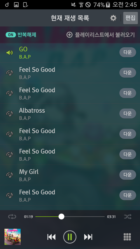 또 한곡만 재생목록에 쭉 세우고 들어도 반영안된데