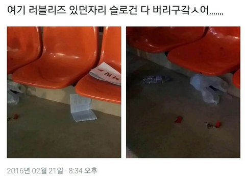 짹쓰니의 글로 오해가 생긴건 맞지만 러블리즈가 공연 시작 5분전에 과자 사와서 공연 시작해서도 과자 먹은 거 맞고 슬로건 자리에 다 놓고 간 것도 맞아 자리만이 아니라 바닥에도 버려져 있었어