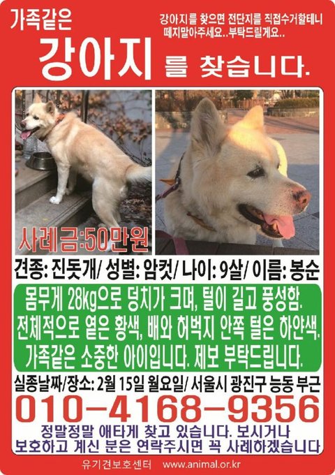 지난 월요일 밤 집을 나간채 돌아오지 않는 진돗개 봉순이를 애타게 찾고 있습니다.