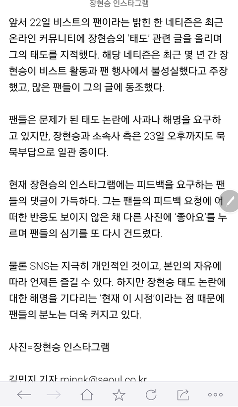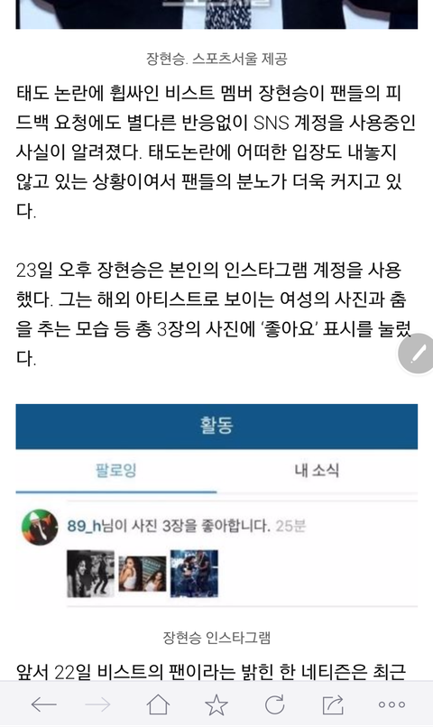 장현승 논란인와중에 좋아요누른거 기사뜸.