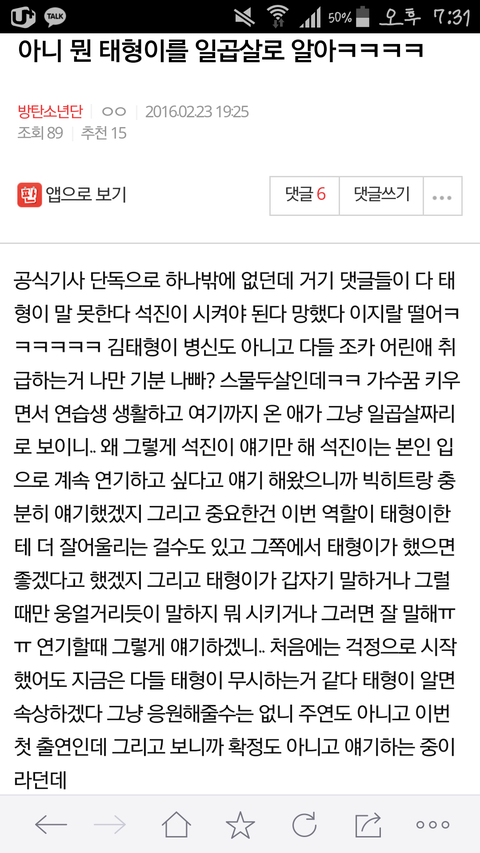 이 글 쓴 이삐가 글 내리라면 내릴게 근데 정말 맞는 말이라 생각해서 올려 태태가 어린애도 아니고 그런 것 하나 못해낼까? 발음이나 태태어도 교정은 해야겠지만 말못한다고 이미지가 굳어져서 그렇지 솔직히 자기가 그런이미지 싫어서 고치려고 했다면 충분히 고쳤을거라고 생각해 뭐든 장난으로 해온 애 아니니까. 우리 역할은 누가 하냐 차라리 쟤 시켜줘라 쟤가낫다 평가하고 편 가르는게 아니고 그냥 응원 열심히 해주는거라고 생각해 물론 약간의 비판이 없을순 없고 그건 태형이가 달게 받아 들여야 하고. 글 내리라면 내릴게 읽어줘서 고마워