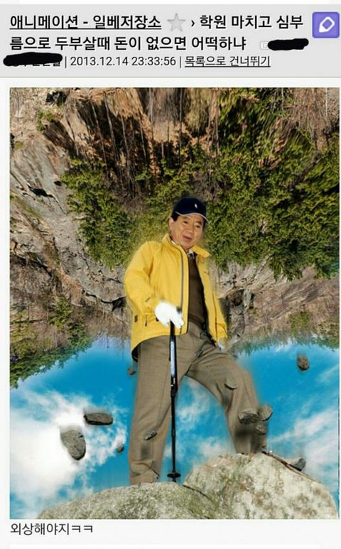 평지 사진을 굳이 돌려서 절벽처럼 보이게 하고 두부 드립을 한다? 일베충 의심 받는 거 당연해보이는데