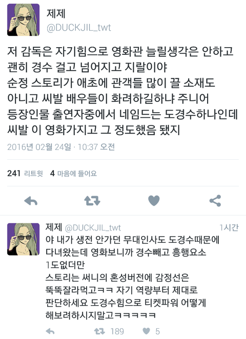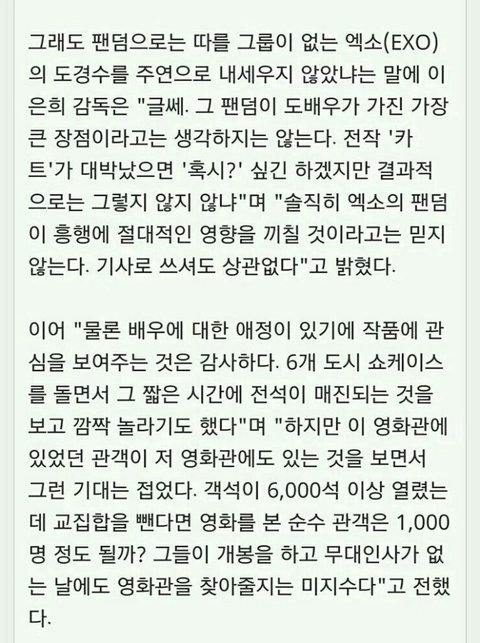 경1수 걸고 넘어지고 지랄; 지 영화보러 기는게 아니고 우리 경1수 보러 가는건데 지 영화가 잘나서 쇼케이스 매진된줄 아나봐 그러면서 조카 당당보스ㅋㅋㅋ인터뷰로 써도 상관이 없대ㅠㅠㅠ이거 엑소엘 무시한거 아니냐 관객수 늘려주는게 누구 때문인데;아오 그러면서 카트는 왜 언급함 이건 예의가 아니라고 생각함