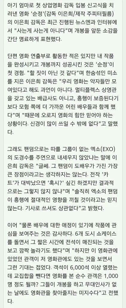 감독 인터뷰 어디에서 카트를 후려치냐??단지 배우팬덤이 영화관객수에 영향을 미치지 않는다...영화자체로 평가받을거라는 내용이지...디오팬이들 엑소팬덤 극성이미지 만들면서 유난 떠는 거 짐심 극혐임