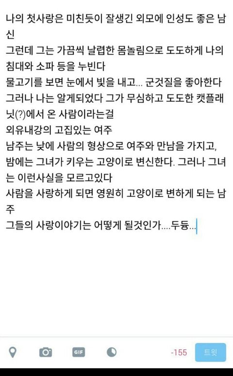 애초에 괭이가 대본 읽을줄은 앎? 설마 세훈이가 고양이인척 그 등치에 몸 둘둘말아서 야옹야옹 거리진 않케찌..........ㅅㅂ....여자 이쁘네....