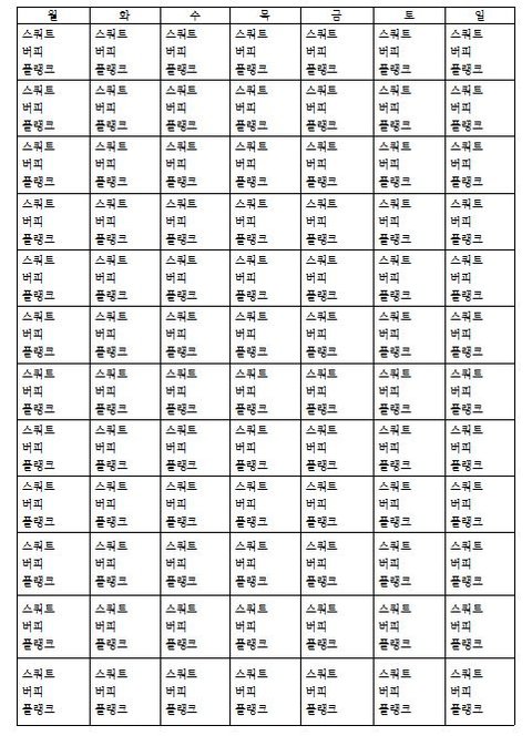 많은 분들이 요청하셨던 운동계획표 파일 링크 입니다! 제가 수정해서 숫자 있는 부분은 지웠어요!개수와 세트 수는 자신에게 맞게 수정하시면 될 거 같아요!