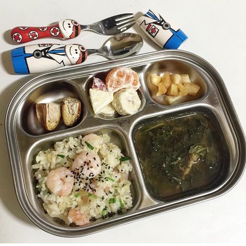 밤만쥬 / 과일샐러드 / 깍두기 / 새우볶음밥 / 냉이된장국 입니다.