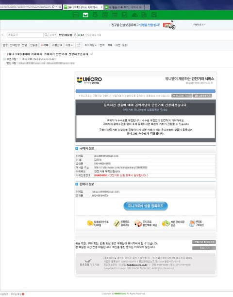 처음에는 중고나라에 글 올린지 몰랐는데 어제 저녁에 혹시 몰라서 다시 로그인 해보니 유니크로 안전거래 메일이 와서 확인했더니 이미 한 사람이 당하고 있는 중이였습니다.