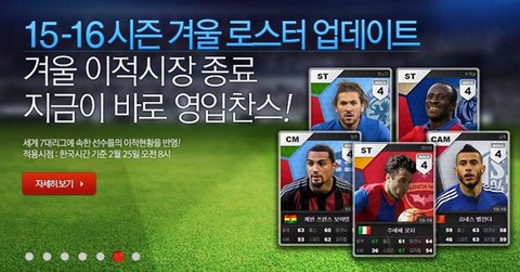 축구 시뮬레이션 게임 '풋볼데이'에서 2015-2016 유럽축구 겨울 이적시장을 반영한 로스터(Roster) 업데이트가 적용됐다. 이번 로스터 업데이트를 통해 각 팀에 영입된 신규 선수카드가 추가됐다. 이적 선수는 소속클럽과 카드 이미지가 변경되며, 능력치를 비롯한 다른 항목은 변경되지 않는다. 참고로 새로운 선수카드는 게임 내 상점에서 구매할 수 있다.