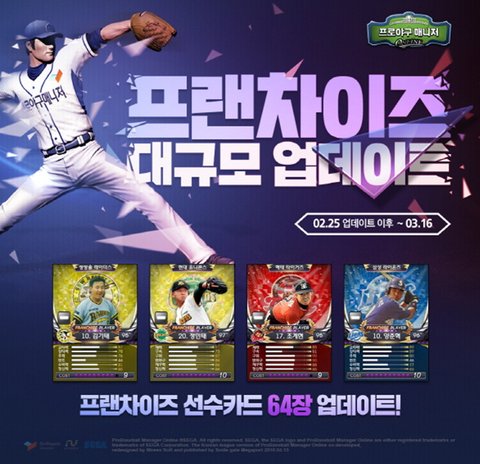 야구 시뮬레이션 게임 '프로야구 매니저' 2016년 첫 번째 대규모 업데이트가 실시됐다. 이번 업데이트를 통해프랜차이즈 선수 카드 64종을 추가했다. 프랜차이즈 선수 카드는 각 팀의 간판 선수들로 구성된 고급 카드로, 1군에 등록할 경우 동료들의 능력치를 상승시킬 수 있다.