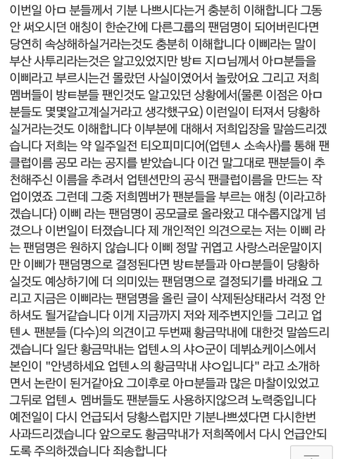 이렇게 팬클럽명 공지글이 올라왔습니다 저 세개의 후보가 팬클럽명의 최종후보로 알고있습니다 하지만 이 세개의 후보마저도 약간의 문제가있어 소속사에게 메일 그리고 카페글을 통하여 문의중입니다 이처럼 저희는 이제 더이상 이삐라는 애칭을 사용하지 않게되었습니다 그리고 또 몇분뒤 ㅈㅣㄴ님사건의 당사자인 업텐ㅅ멤버와 이삐사건과 황금막내사건의 당사자인 멤버 두명이들어와