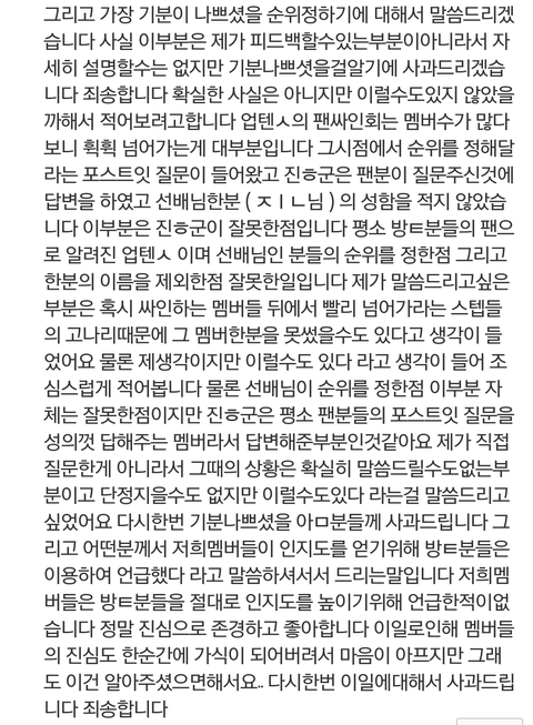 인녕하세요 저는 업텐션팬입니다 이번일로 인해 상처를받으신 아ㅁ분들과 방ㅌ분들 그리고 업텐ㅅ과 팬분들께 죄송하다는말씀을 드리고 싶어요 서로 상처도 많이 받았고 되돌릴수 없을만큼 멀리 와버렸지만 저의 피드백 그리고 사과문을 읽어주셨으면해서 글을 올립니다 글솜씨가 부족해서 이해가 안되실수도있겠지만 긴글 읽어주시면 감사하겠습니다