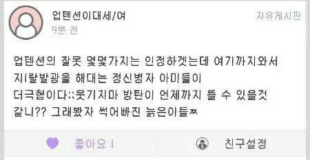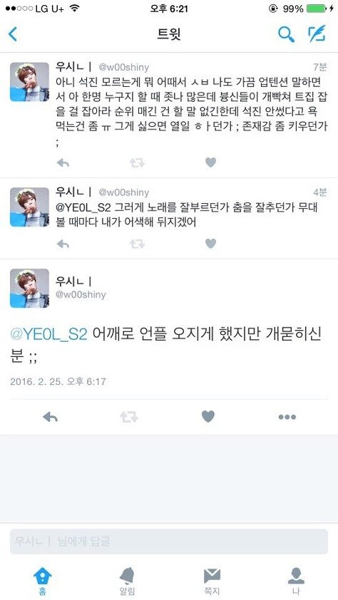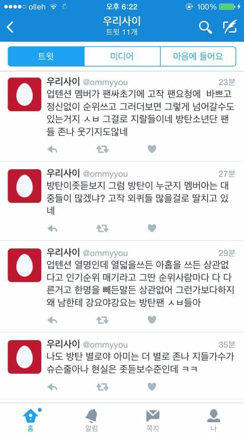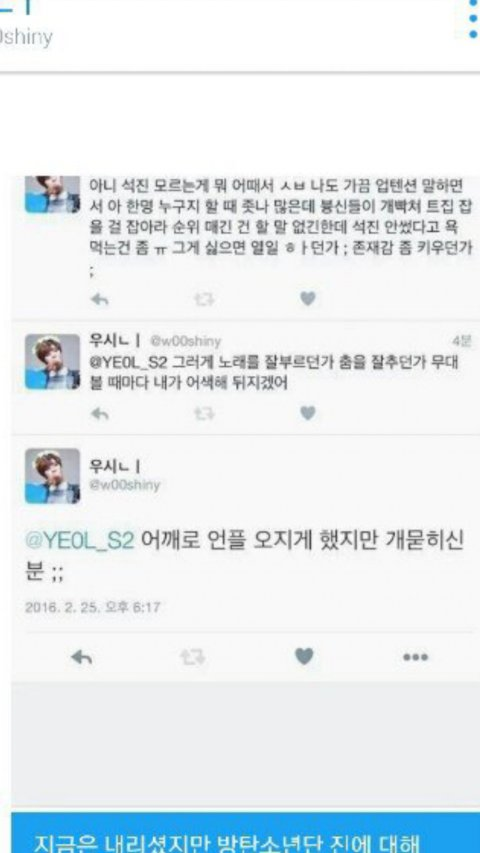 모든 커뮤니티에서의 방탄소년단 비하에 대해서는 정말 죄송하게 생각 중입니다. 트위터 우시ㄴㅣ 분은 제가 트윗을 보낸 상태입니다. 우리 사이 분에게는 계정 두 개 다 차단을 먹었고요, 계속 인증을 하람에도 불구하고 업텐션 팬 분들을 모두 차단하는 것으로 보아, 팬 코스프레가 아닌가 싶네요. 지능형 안티일 확률이 좀 더 높아 보여요. 이 우리 사이 분 말고 업텐션 실드를 친답시고 타 팬 분들, 타 가수 분들을 욕하는 분이 계신다면 댓글로 알려 주셨음 좋겠습니다. 또 몇 개의 트위터를 다 찾아서 다 그만하라고 인증해 달라고 말을 해 보았지만 돌아오는 건 차단이었습니다.... 어떻게 해야 할지 모르겠습니다 정말,... 그냥 죄송하다는 말밖에 안 나오네요 정말 죄송합니다. 내용은 계속 추가할 예정입니다. 죄송합니다.
