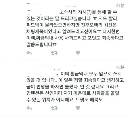 위에 말을 한 팬이 정말 뭔가 잘못 알고 계신 것 같아요. 죄송합니다 또, 정말 신인이라 자기 마음대로 사과글을 올릴 수 있는 위치가 아니라는 건 무슨 소리인지 모르겠네요 정말. 이해가 안 가요.... 또 진후 군이 먼저 채팅방으로 사과를 한 이유는, 팬들이 계속해서 피드백 요구를 하며, 재촉을 해서 진정을 시키려고 했던 거예요. 진후 군이 사실 원래 잘 카페에 안 들어오는 멤버예요. 오늘 피드백 때문에 카페 확인하려고 왔던 것 같아요. 정말 죄송합니다 진짜....... 또, 회사에서 메일을 읽지 않는다고 하는 분이 계셔서 드리는 말씀입니다. 지금 팬들이 공카에 올린 피드백 권유 글은 다 리턴이 된 상태입니다. 한마디로 확인을 했고 올리겠다는 뜻이죠. 업텐션 팬들도 정말 많은 메일을 보내서 확인하기 힘들 겁니다. 제가 최대한 올라올 수 있도록 열심히 할 테니까 걱정 마시고 진정하셨으면 좋겠어요.... 감사합니다. 죄송합니다.