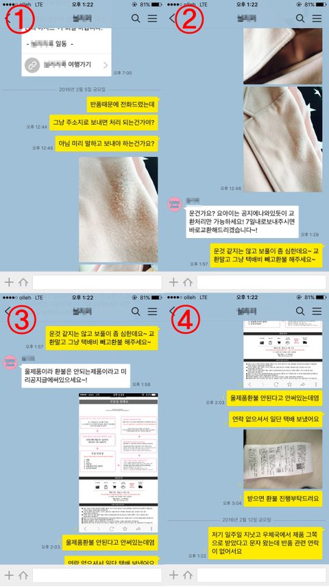 <공지> 글에 ‘울 제품’이 환불이 안 된다는 문구는 없어서 캡쳐 후 사업자에게 전송후 울제품 환불 불가 관련 공지 없다고 답장하였으나 그때부터 카톡을 읽지 않음,