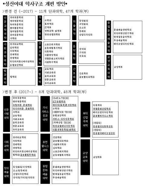 법학과: 단과대학이 없어져버린 법학과. 개편 전 성신여대 법학과는 법과대학에 속해있었음. (현재 단과대 안에 '법학과'가 단독으로 존재하는 학교는 적음.)그러나 개편이 될 경우 법학과는 사회과학대학에 속해 단순한 하나의 과가 되어버림. 하나의 단과대로 존재할 때와 사과대에 포함된 과로 존재할 때 교육에 대한 지원, 법학 연구에 관한 다양성들이 모두 떨어지게 됨. 법과대학이라는 단과대로 존재할 때도 행정법 교수님을 끝까지 안 모시고 왔었는데 과가 될 경우 처우는 더 안좋아 질 수 밖에 없음
