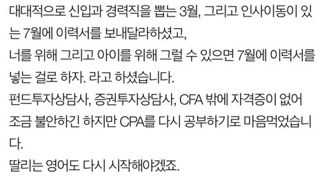 더군다나 아는 팀장님이라면서...그리고 5개월동안 공부 죽어라 하겠다고 하면서 딴다는 자격증이 cpa?? 5개월동안 공인회계사를 딴다고?? aicpa말하는건가 그것도 아무리 cfa가 있어도 5개월만에 풀타임으론 안될텐데 이해가 안가고...