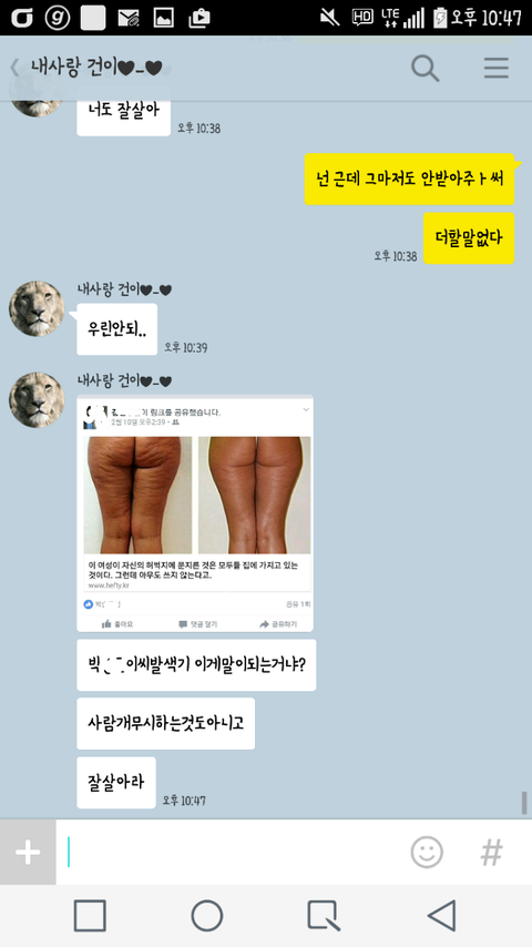 지우고있는데 남친은 카톧으로 계속 자기 화를내는거야. 그러면서 내전남친2다 내가 공유해둔 다이어트정보를 공유해갔거든? 2주일전에? 그거보고 눈돌아서 난리난리치는거지.... 좋아요를 왜누르고 공유를 왜하느냐고..... 휴. 답답하고 스크롤은 다시내리고있고 페친도끊었고 게시물도제우고있는데 뭔말도많고 욕할게많은지 걔 친구등란테 우리얘기물어봤는데 내가 이기적인거라고그랬대. 아마 싸움초기때 얘기한거같은데 그때는 갑자기 내친구 삭제하라고 한참지난거 들춰서 지우라고해대니까 싫다고 귀찮아서안지운거라고그런거였는데... 친구들이 했다는말들으면 그때얘길를 주로 한거라고 유추가 되...