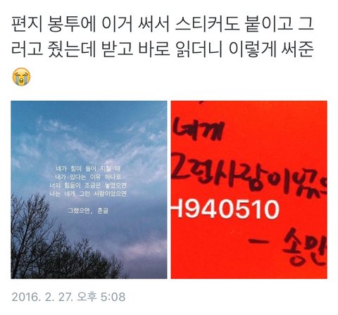 어떤 팬이 저 글귀 보여줬나봐 그래서 미노가 "나도 네게 그런사람이였으면" 이라고 적어줌.. 사진이 짤려서 잘 안보이는데 하튼 사스가송다정 말너무이쁘게해ㅠㅠㅠㅠㅠ나도 미노가 힘들때 내가있다는이유로 힘듦이 조금 놓여주는 존재가 되었음좋겠다