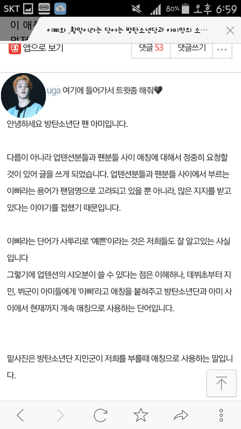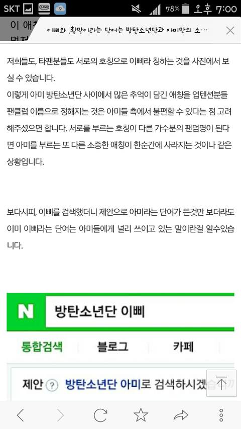 몇몇 아미들 알거에요 본론 바로 들어갈게요 우리 방탄들이 쓰는 '이삐'가 곧 아미인거알죠? 그런데 후배인 업텐션이라는 그룹이 그 이삐를 팬덤명으로 고려하고있다해요 팬들도 좋다 그러고 근데 이게 정말 어이없는일이거든요 그거 알아요? 네이버에 방탄소년단 이삐라고 치면 밑에 제안 질문에 방탄소년단 아미로 검색하시겠습니까?라고 떠요 확실하죠 그런데 업텐션이 계속 트위터에 이삐 이삐 거려요 아미로선 너무 기분 나쁘죠 방탄과 추억이 있는 호칭인데. 선배로서 존경을 하면 예의 지켜요 그리고 순위를 매겨요 왜 자기들이 뭔데 그중에서 진이 빠졌다죠? 진 존경하는거 맞아요ㅋ?