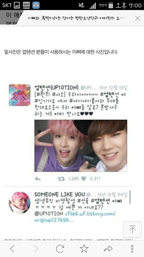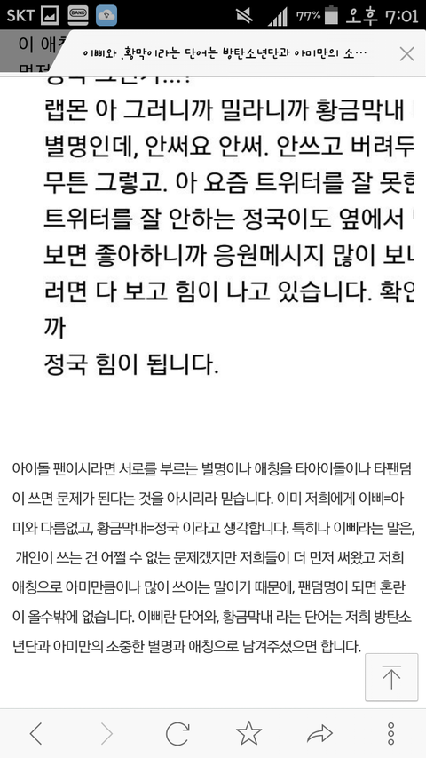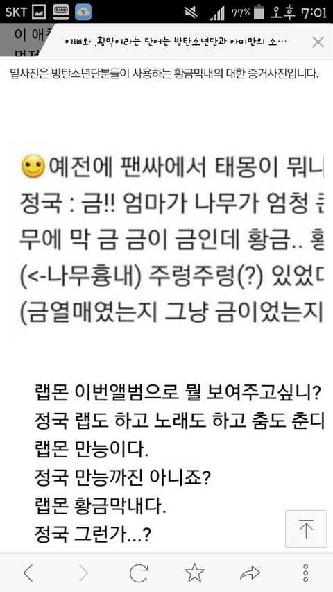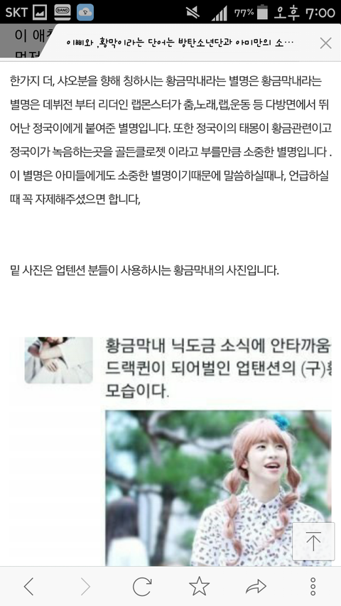 그리고 정국이 별명 황금막내. 그 별명을 업테션 막내가 쓰고있다네요? 이것도 불쾌하네요 솔직히 아미들은 다 기분 나쁠거에요 진짜 이거 듣고...너무 짜증났어요 긴글 다 읽어야 이해될거에요 감사합니다 (다시 한번 카스 트위터 페북 블로그에 알려주세요 이삐.황금막내 막아야합니다 알릴땐 저희 밴드이름 제 닉네임 가려주세요 너무 부탁드립니다)