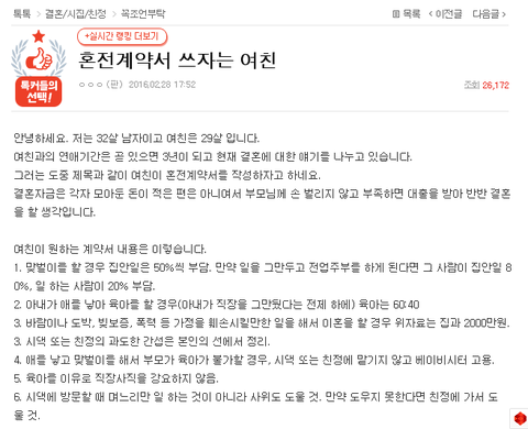 그런데 어제 '혼전계약서 쓰자는 여친' 글을 남친과 봤습니다.
