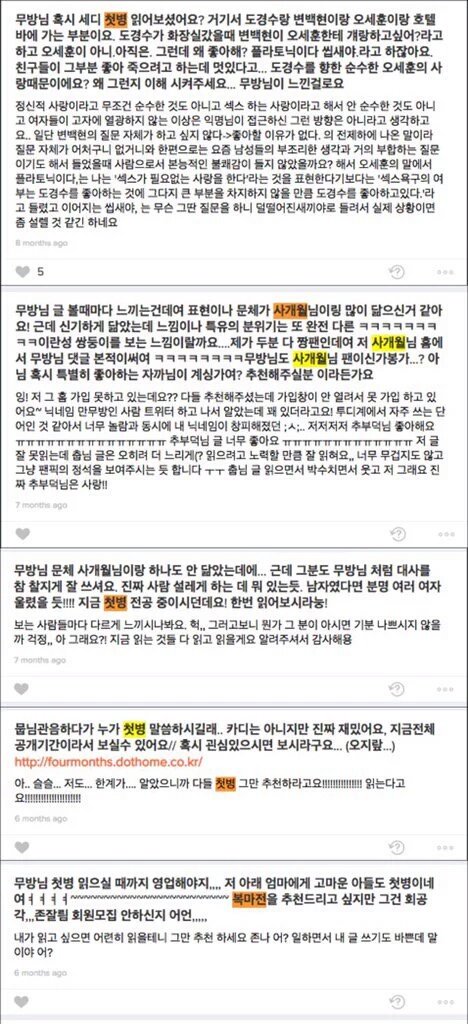 6개월 전 애스크 답변에서는 첫1병을 읽은적이 없다고 못박음. 하지만 저 애스크 답변 전, 2015년 7월 15일 연1애의미1학 17편에서 표절한 문장을 썼음ㅋ 그래놓고 비슷하다 그래서 추천한다니까 저렇게 화를내며 천연덕스럽게 읽어본적 없는척함.