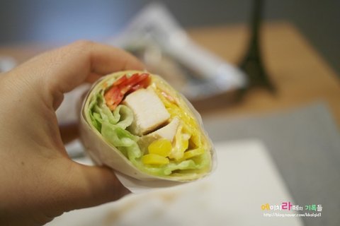 또띠아에 양상추+치킨+파프리카넣고 허니머스타드뿌린 치킨랩.