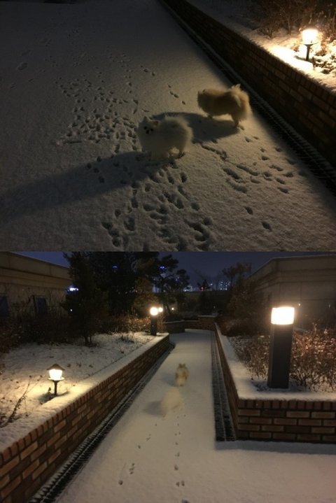 요건 얼마전인데요 씻기전에 잠깐나갔는데 눈이오네요~ 신나하는게 보이죠? 귀여미