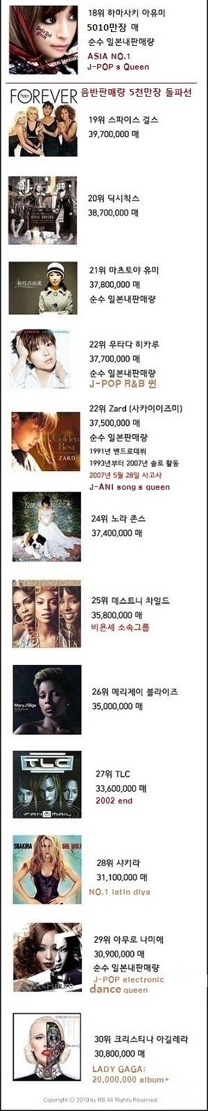 ●세계 여자 가수 역대 앨범 판매량 순위●1.마돈나 2.셀린 디온3.머라이어 캐리4.바브라 스트라이샌드5.휘트니 휴스턴 6.엔야 7.샤니아 트웨인 8.브리트니 스피어스9.샤데이10.자넷 잭슨11.카일리 미노그 11.비욘세 12.글로리아 에스테판 13.리바 매킨타이어14.린다 론스태드15.티나 터너16.다이애나 로스17.엘라니스 모리셋18.셰어 19.하마사키 아유미20.스파이스 걸스21.딕시칙스22.마츠토야 유미23.우타다 히카루24.자드25.노라 존스26.데스티니스 차일드27.메리제이 블라이즈28.티엘씨29.샤키라30.아무로 나미에 [출처: 일간베스트 저장소]