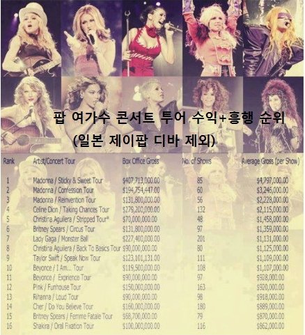 ●세계 여가수 콘서트 투어 역대 수익+흥행 순위● [미국 팝 디바(여가수)] 1.마돈나 2.셀린디온 3.브리트니 스피어스 4.비욘세 5.레이디 가가 6.크리스티나 아길레라 7.테일러 스위프트 8.핑크 9.리한나 10.셰어 11.샤키라 12.카일리 미노그 13.바브라 스트라이샌드... [일본 제이팝 디바(여가수)] 1.하마사키 아유미 2.아무로 나미에 3.코다쿠미 4.우타다 히카루 5.마츠다 세이코 6.마츠토야 유미 7.미시아 8.쿠라키 마이 9.나카시마 미카 10.보아11.소녀시대[ 출처: 일간베스트 저장소 걸그룹.연예인 게시판 ]