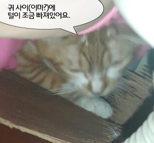 귀 사이(이마?)에 털이 조금 빠져 있어요.