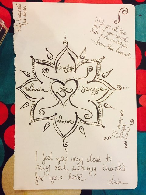 이 친구가 스페인으로 돌아가는날 우리에게 편지를 써주었어요. "싸뿌치밀레가" 힌디어로 "모든지 다 이루어 지리라"라는 말이래요.