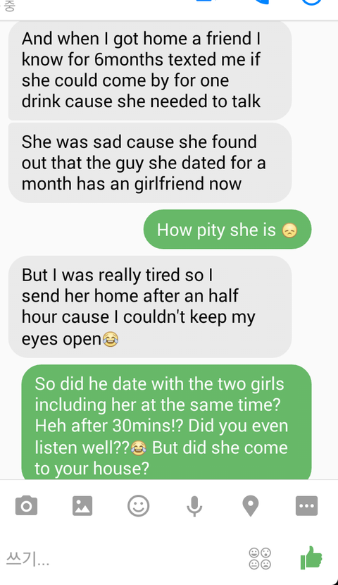 "근데 내가 너무 피곤해서 30분만에 집에 돌려보냈어" 이러면서 웃음 이모티콘을 붙이더라구요. 근데 여기서 펍이 아니라 집으로 왔다는 건가..? 싶어서