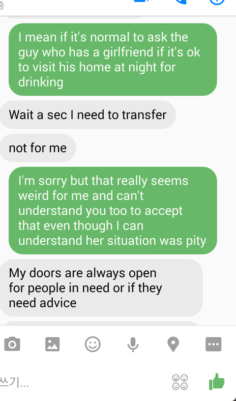 "그게 너네 나라에서는 흔해?(새벽에 여자친구 있는 남자 혼자 사는 집에서 오랜 친구도 아닌 6개월 알고지낸(저는 그런 여자를 알고 지내는 줄도 몰랐구요, 어디서 어떻게 만난건지도 몰라요. 다만 매주 펍을 가니까 그런데서 만난게 아닐까라는 추측이 들더라구요) 여자랑 단둘이 술을 마시는 것이라는 의미였어요)" 남자친구는 바로 이해를 하더라구요.