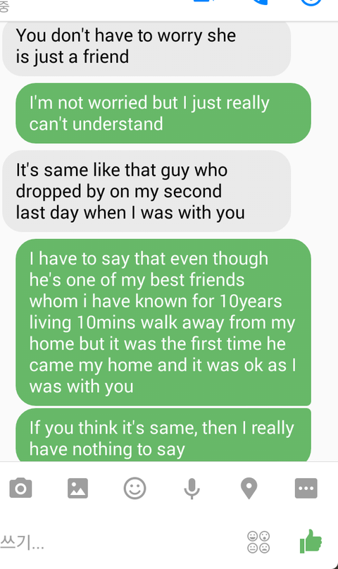 "분명히 말하고싶은건, 그 친구가 비록 내가 10년동안 알고지냈고 집이 10분거리밖에 안되는가장 친한 친구 중 한명이지만 그때가 우리집에 처음 온거였고 너가 나와 함께 있었기때문에 오라고 한거였어. 너가 이거랑 그거랑 같다고 생각하면 난 정말 할말이 없다." 그랬더니