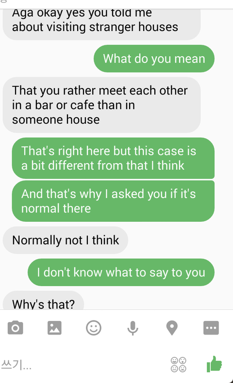 "아. 그래, 한국에선 집에서보다 술집이나 카페에서 많이 만난다고 했던거 너가 얘기했었어.""여기선 그래. 근데 이 상황은 그거랑은 좀 다른거 같다. 그래서 내가 너한테 이게 너네 나라에선 흔한거냐고 물어본거였어." 라고 하니까 그렇다고 한거랑 다르게"일반적으로는 아닌거 같아 내 생각에" 라고 그제서야 인정하더라구요.
