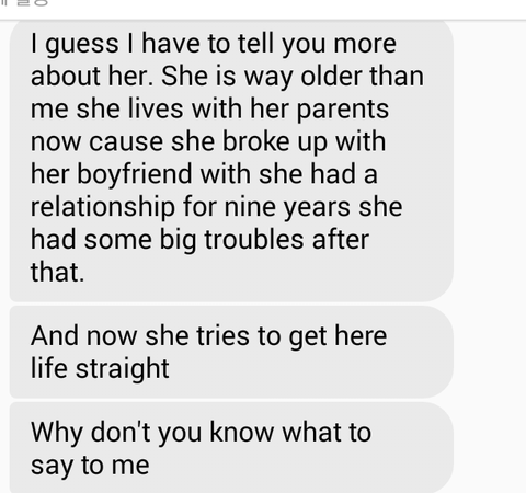 "왜? 나도 너한테 그녀에 대해 더 얘기해야 될거같아. 그녀는 나보다 나이가 몇살 이상 많고 지금은 부모님이랑 같이 살아. 왜냐하면 9년동안 동거했던 남자친구랑 깨졌기때문이야. 그 이후로 몇몇 큰 문제들이 있었어. 그리고 지금은 다시 제대로 인생을 살려고 노력해. 나한테 왜 더이상 할말이 없는거야?" 라고 하더라구요.
