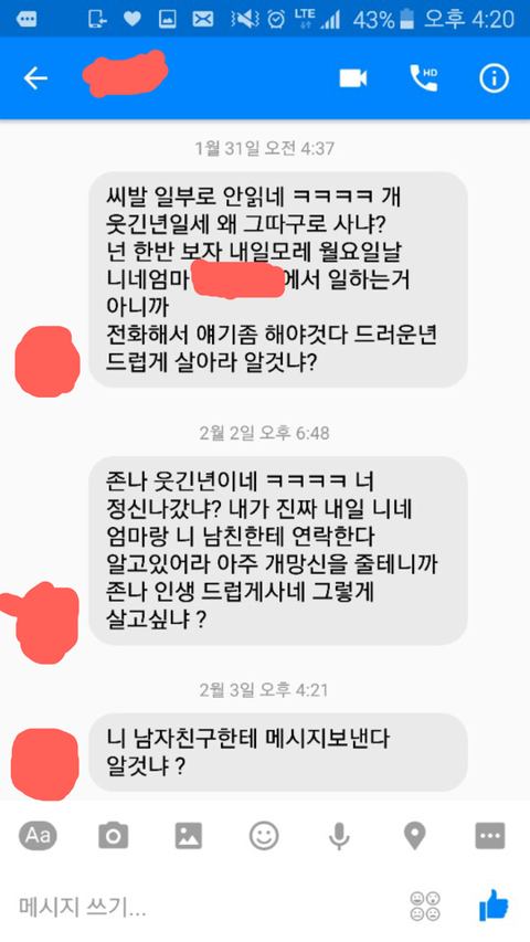 최근 지인한테 지속적으로 협박을 하기시작함 돈안내놓으면 니남친(지인 현남친)에게 수건라고 소문낸다 니네엄마한테 말한다 지역에서 소문낸다 등 엄청난 욕설과 함께 협박성 페메와 카톡을 보내기시작함 그리고 페이스북에는 형사건으로 고발한다 어쩐다 써놓음 (이름은생략되있지만 죽여버린다 어쩐다 까지 써놓음 ) 이미 현남친에게는 둘이 사귈때있었던 사적인일들 얘기함 부모님께도 전화함 부모님이 둘의 문제니 알아서 하라고 하니 두모녀가 똑같다니어쩧다니 모욕감을줌
