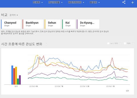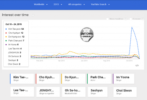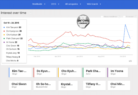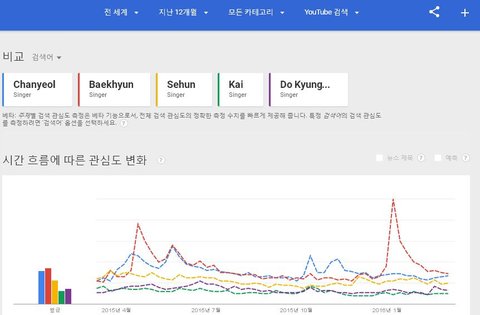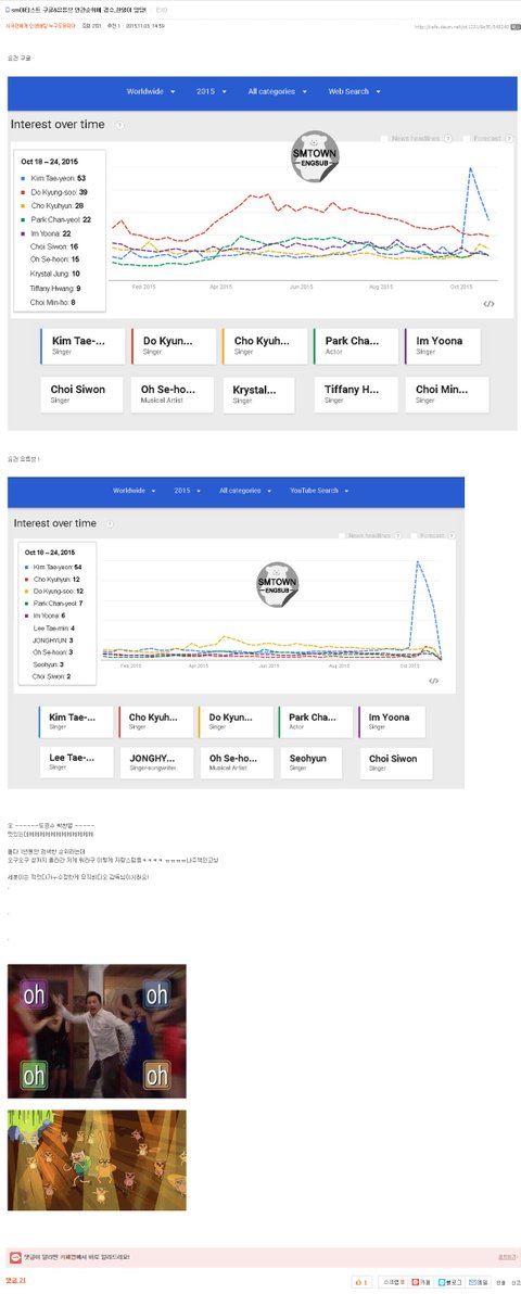 이걸가지고 2015년 연간 sm아티스트의 구글 유투브 서치 순위라고하면서