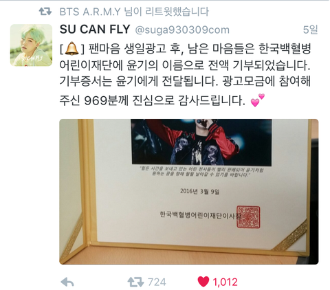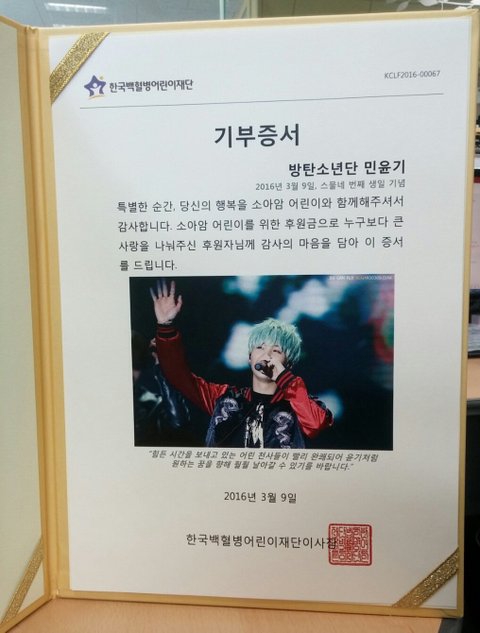 윤기 생일 광고 후 남은 금액 백혈병 아이들을 위해